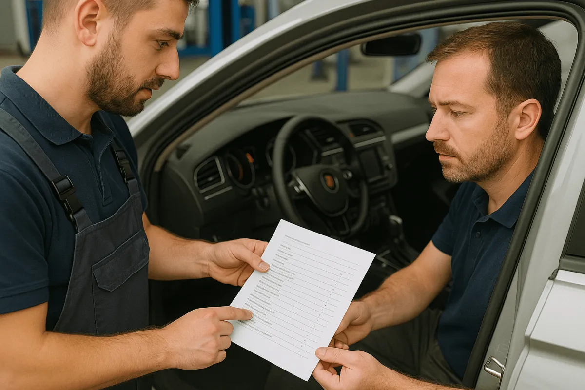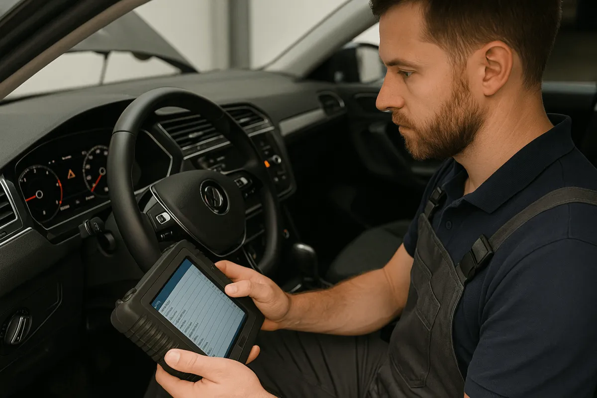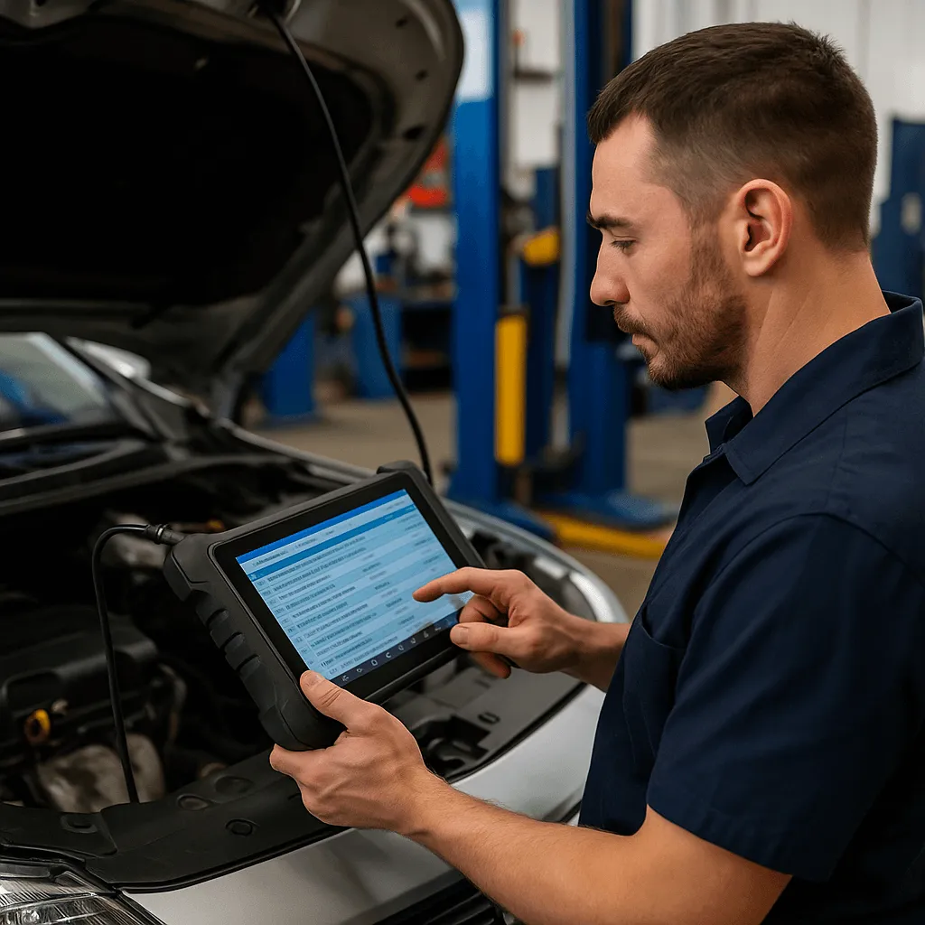 Un mecanic folosește un tester profesional pentru a verifica toate sistemele electronice din mașină.